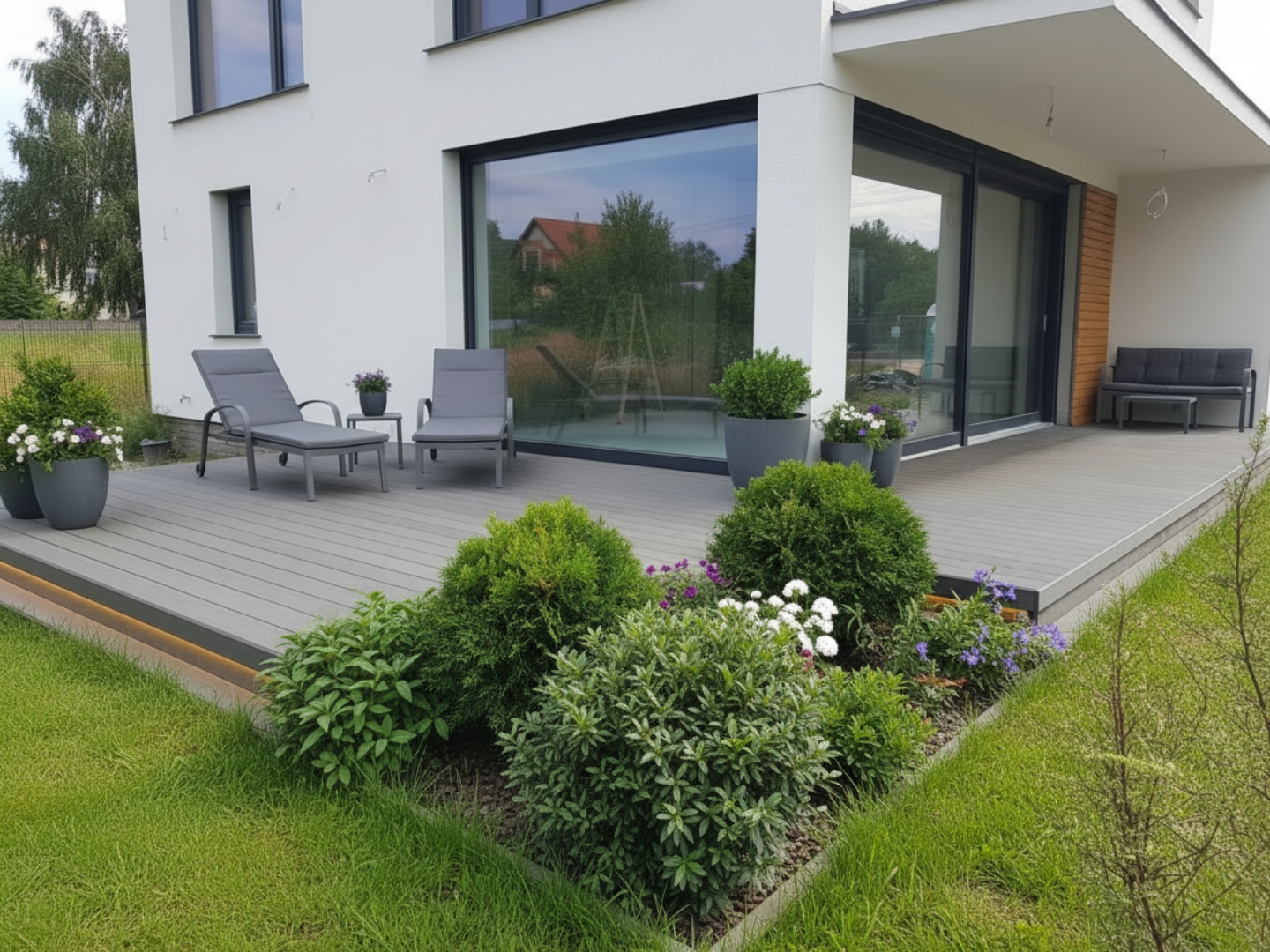 Prezentowana na zdjęciu realizacja to idealny przykład wykorzystania potencjału deski Twinson. Grafitowy taras stał się naturalnym przedłużeniem salonu, tworząc spójną przestrzeń z nowoczesną, białą bryłą budynku.